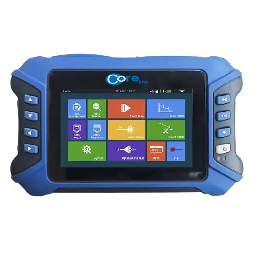 A portable Mini OTDR from Corelink, designed for precise fiber optic network testing, with a range of up to 100km.